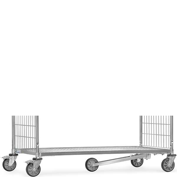 Spurrolle zu Kommisionierwagen – zusätzliches TPE-Rad Ø 125 mm an einem federbeaufschlagten Profilstahlarm als Führungsrolle für guten Geradeauslauf, Rotation um 360° bleibt