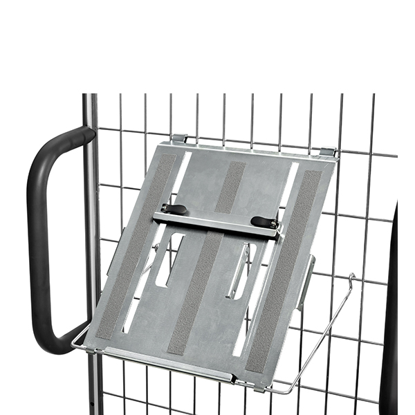 Tablethalterung zu Kommissionierwagen – Masse (BxHxT ) 200 x 15-295 x 14 mm – Stahlblech verzinkt – Fixierung der Geräte mit Exzenterspannern, Klemmleisten mit