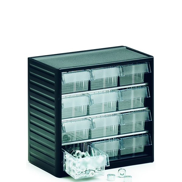 Kleinteilmagazin Serie 290 – Masse (BxTxH) 310 x 180 x 290 mm – mit 12 Schubladen L-04 transparent, Masse (BxTxH) 92 x 175 x 59 mm